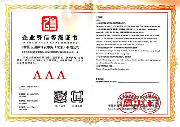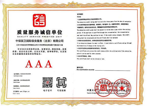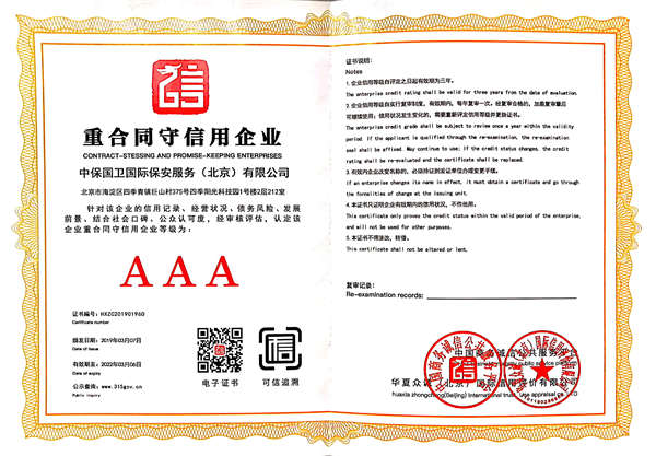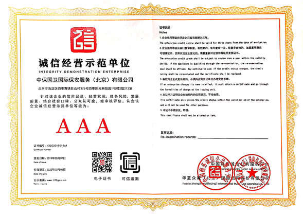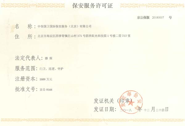 中保國衛(wèi)國際保安服務(wù)(北京)有限公司,屬中保國衛(wèi)集團(tuán)旗下子公司。能全方位的為大型客戶提供優(yōu)質(zhì)的安保、押運(yùn)服務(wù),是集人防和技防于一體的新型正規(guī)化綜合安保押運(yùn)服務(wù)企業(yè),提供人防、物防、技防、聯(lián)網(wǎng)報(bào)*、非武裝押運(yùn)等安防相關(guān)的一站式服務(wù)。 公司在國內(nèi)多省設(shè)立有分公司及分支機(jī)構(gòu),著重提升安全押運(yùn)、智能技術(shù)押運(yùn)及安全技術(shù)防范相關(guān)的服務(wù),業(yè)務(wù)范圍覆蓋全國一、二線城市、港澳地區(qū)以及海外地區(qū)。安保方面主要為政府機(jī)構(gòu)、金融機(jī)構(gòu)、企事業(yè)單位、醫(yī)療衛(wèi)生、高等院校、工業(yè)園區(qū)、大型商場、高檔住宅、智能商務(wù)樓、大型活動提供門衛(wèi)、守護(hù)、巡邏、押運(yùn)(非武裝)、安全檢查、保安特勤、私人護(hù)衛(wèi)、消防中控、安全技術(shù)防范、遠(yuǎn)洋護(hù)航等全方位服務(wù),同時(shí)面向國際市場,為中資企業(yè)在“一帶一路”沿線國家投資提供境外安保服務(wù)。 |